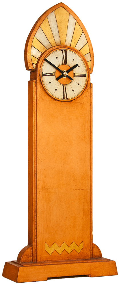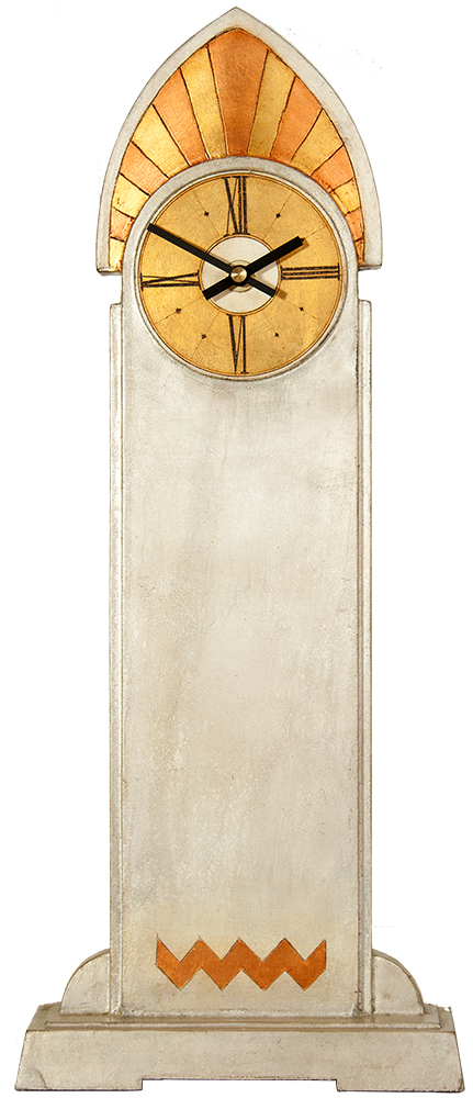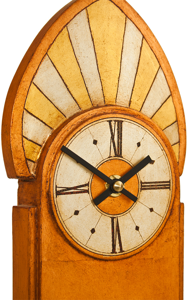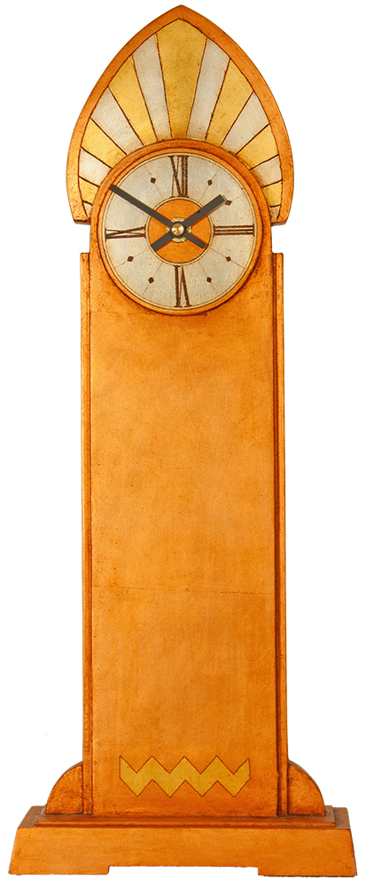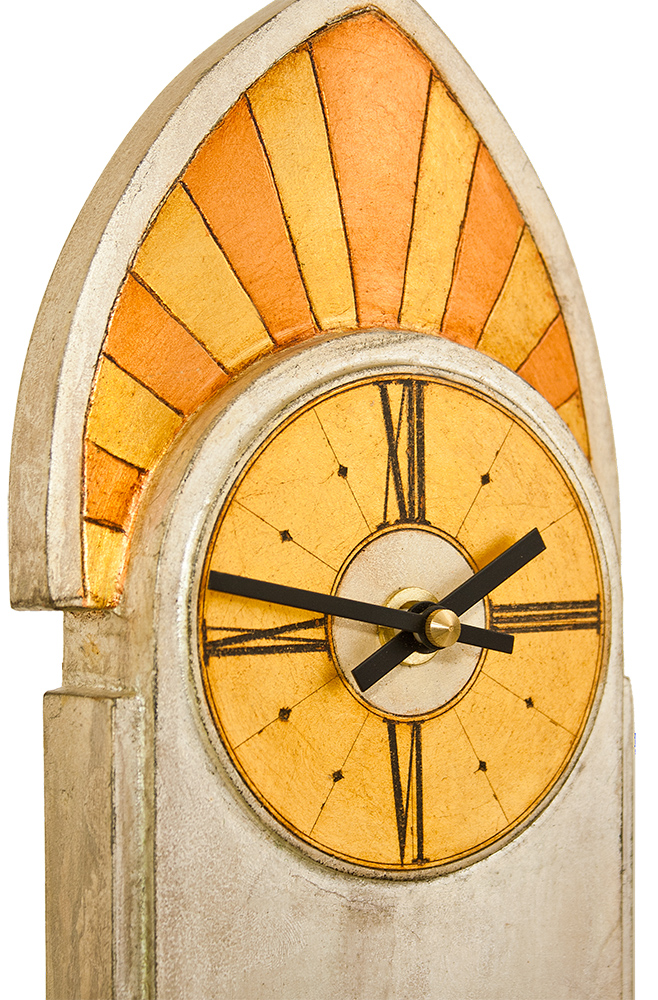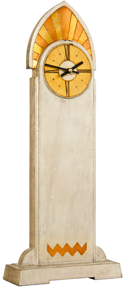 This beautiful Art Deco mantle clock was inspired by the architectural lines of the Crysler Buiding and enhanced through a mixed leaf gilded finish.