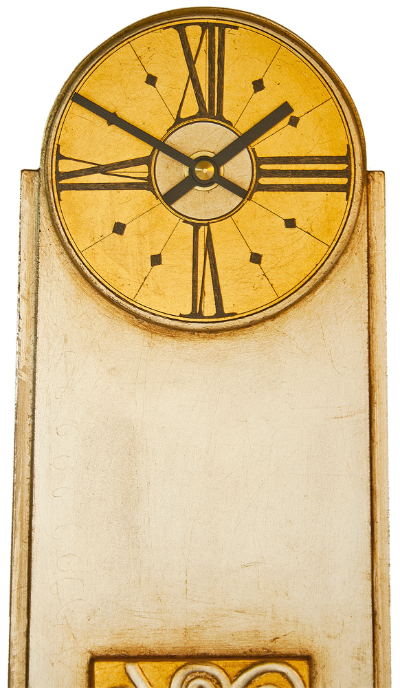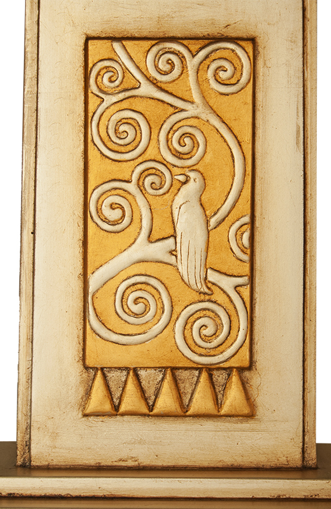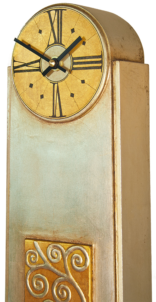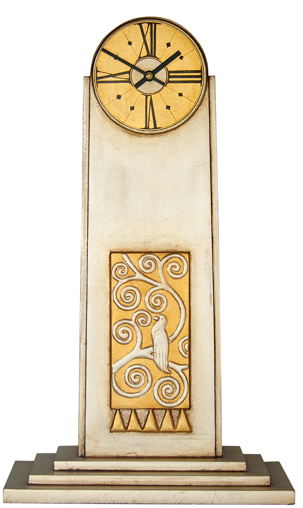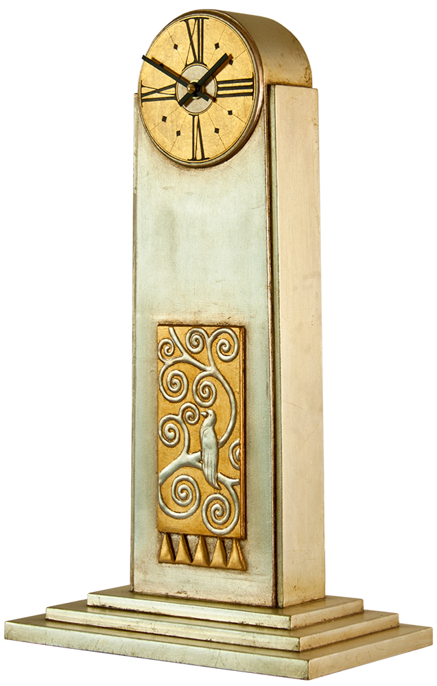 The clean geometric lines of this Art Deco Mantle clock are set off by a Gustav Klimt inspired illustration that\’s picked out in a mixed gilded leaf finish. The main body of the clock is gilded in silver leaf which has been antiqued to give a dull pewter finish in keeping with the Art Deco style of this decorative mantel clock.