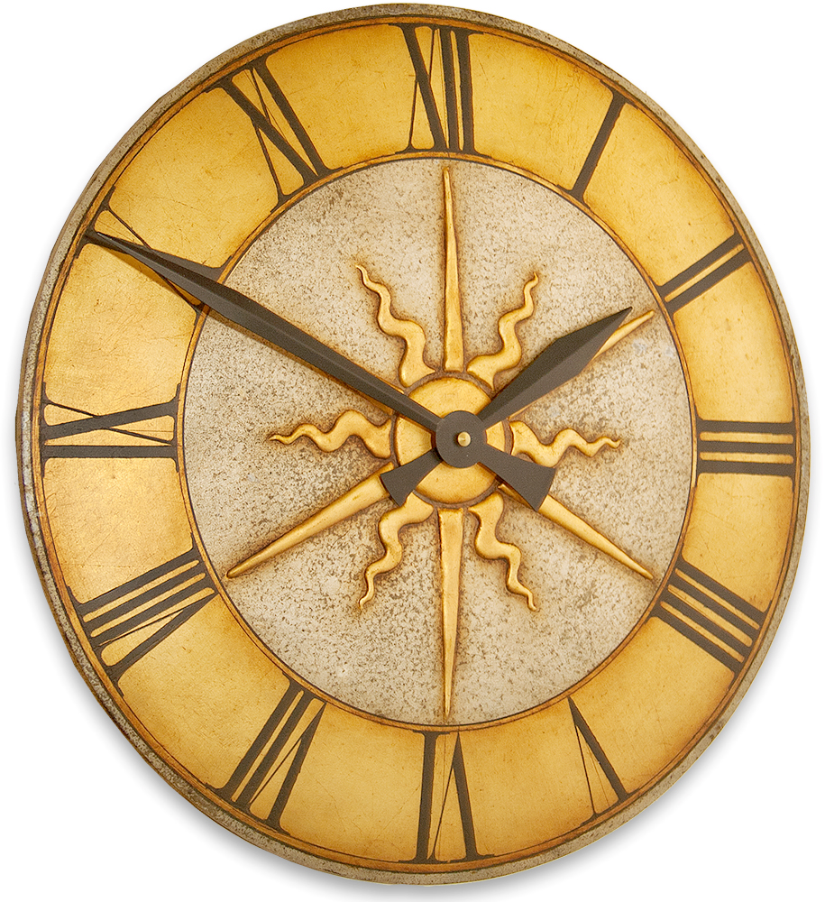 My Large Round Wall clocks are identical to my Medium Round Clocks but for one significant difference which is that they have a domed profile. This feature means that the light plays of their gold and silver gilded surface which shows off the quality of the finish and the raised sun detail at it\’s centre which is applied by hand using a traditional combo\’ technique. In keeping with the handmade nature of my decorative clocks the numerals are hand etched.