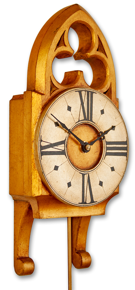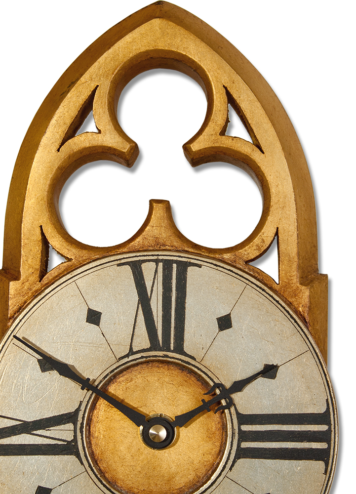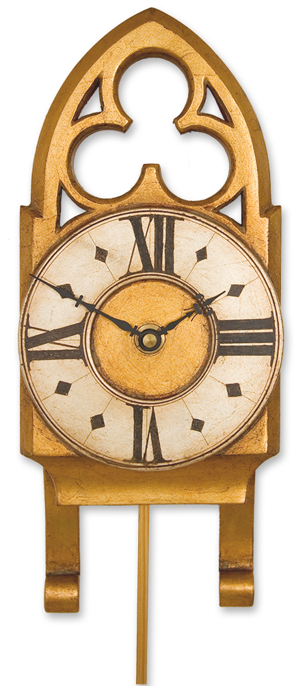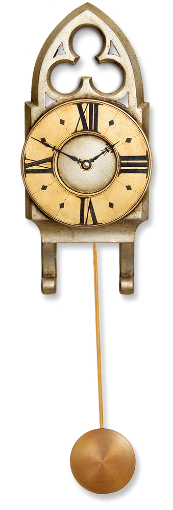 As far as small Gothic pendulum clocks go this one has great character and presence which comes from its beautiful Gothic styling and ornate fretted trefoil pediment. These facets of the design are brought out through the gilded gold and silver leaf finish which is antiqued to give this pendulum clock a suitably aged look.