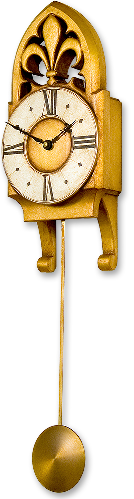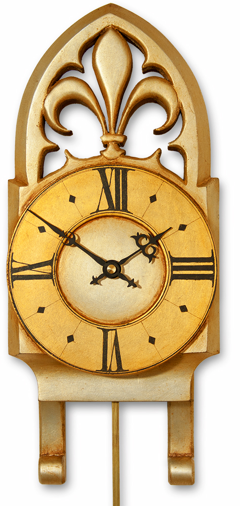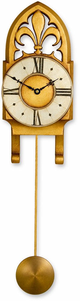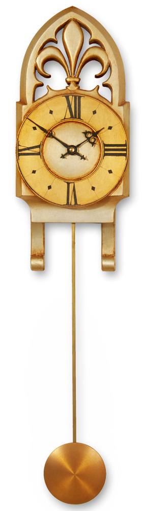 This small Gothic pendulum clocks distinctive character comes from its gothic styling and ornate fretted fleur de lee pediment. This is enhanced by the sympathetic use of an antiqued gold and sliver gilded finish. In keeping with its hand made construction and finishing the clock dial numbers are hand etched. The pendulum length can be reduced in length to suit your requirements.