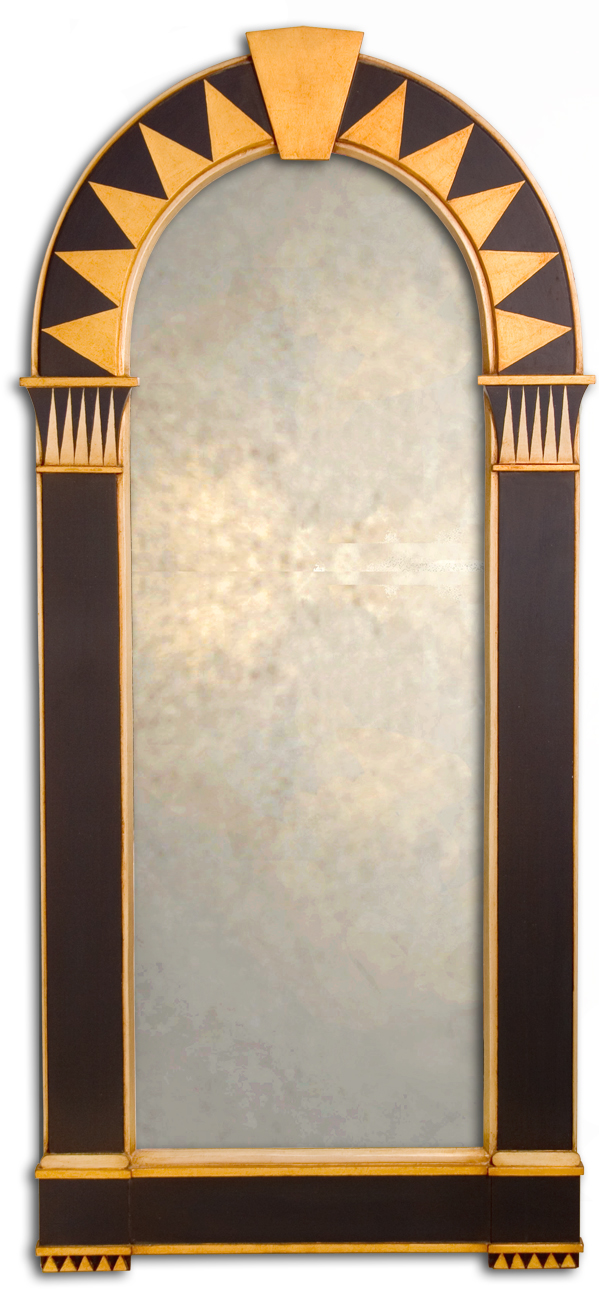 Adopting the classic round arch design typical of the Romanesque or Norman early Gothic Style this decorative arch mirror is finished in a paint and gilded leaf finish reflecting both the Gothic and revivalist Liberty or Art Deco Period.