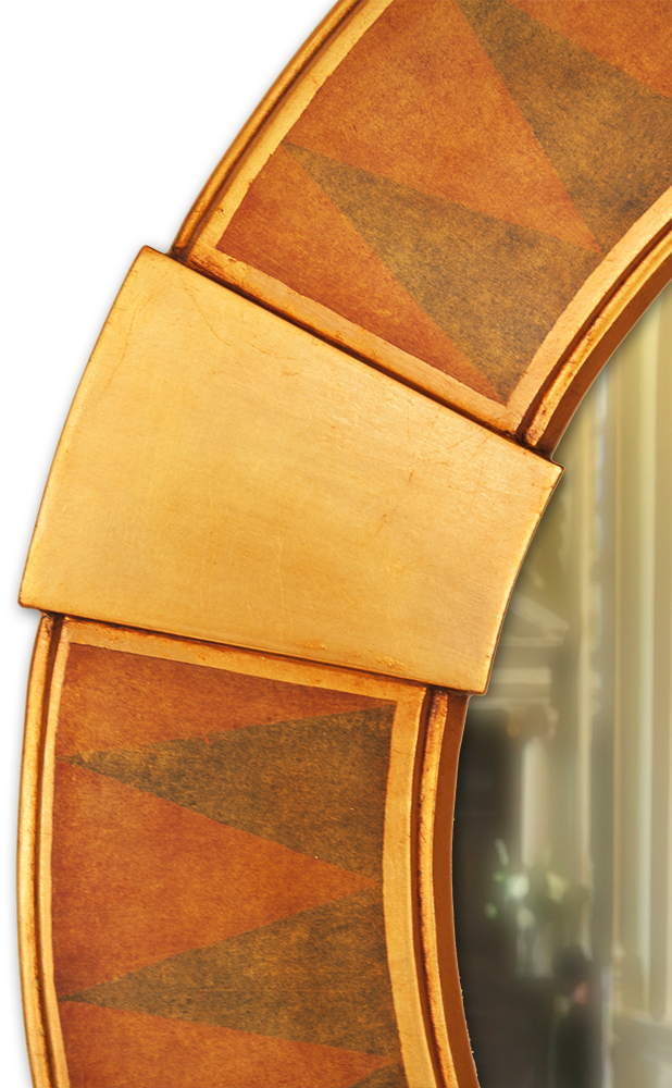 An intriguing round Art Deco wall mirror with key stone details typical of the period and a rubbed gold gilded finish.